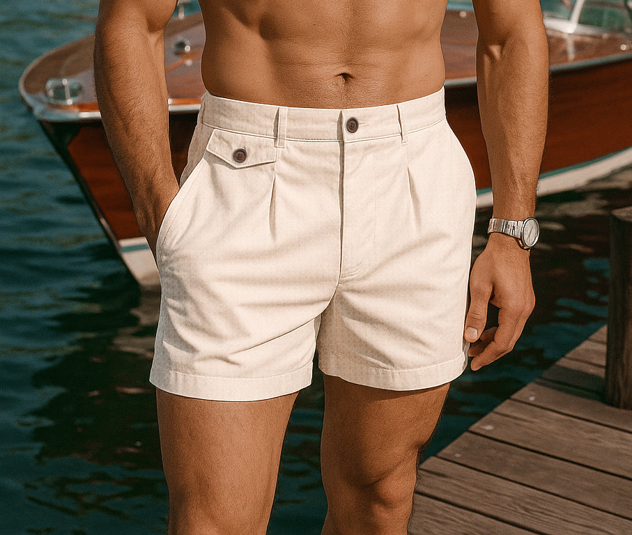 Dettagli esclusivi: bottoni opacizzati effetto legno, tasche laterali e posteriori integrate, passanti per cintura e lacci con finiture in silicone. Versatile in acqua e fuori, perfetto con un blazer di lino per un look elegante e disinvolto.